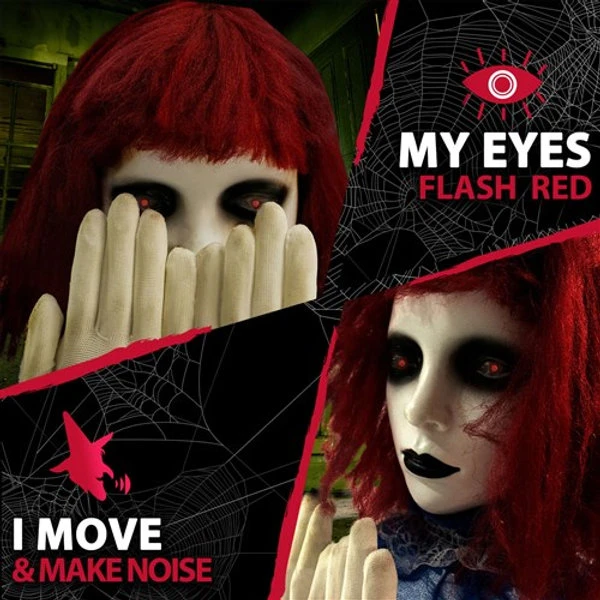 Be very afraid of Haunted Hill Farm’s collection of spooky animatronics. These blood-curdling creatures are sure to terrify any trick-or-treaters, coworkers, or customers. This haunted doll is out for vengeance this Halloween. Her red flashing eyes illuminate the night with her anger and excitement. Whenever victims try to sneak past the demon doll, she pops her head up suddenly, giving each visitor a sudden shock. When she is done with each scare, she retreats back behind her white-gloved hands. She can fit seamlessly next to your holiday treats or on any countertop. Her half figure gives the illusion of her bursting out of the ground. Suspend her from her included hanging loop to give guests a fright from above. No matter where she rests, her chilling voice, shocking red hair, black-rimmed eyes, and menacing melodies will make her alarming presence alarmingly known. For longer prop life, we recommend indoor or sheltered outdoor use protected from inclement weather. For thrills and chills so frightening that your neighbors will run shrieking in horrendous delight, count on Halloween decorations from Haunted Hill Farm