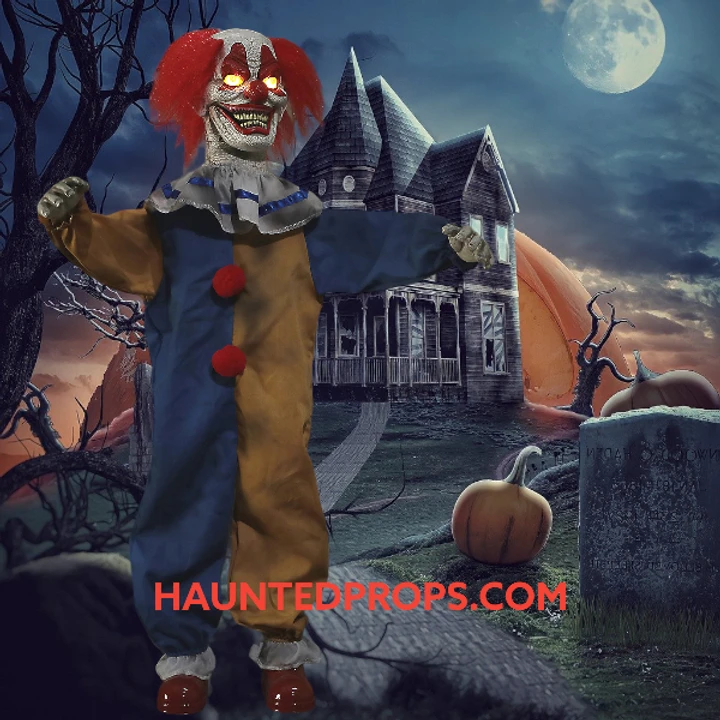 Make way for the Funniest creepy clown ever! This 36-inch Little Top Clown Animated Prop will make all your guests roar with laughter! His Arms Wave back and forth, his Head with Yellow Light-up Eyes Turns, and his wide colorful Mouth Moves while he Speaks 4 different Hilarious Phrases:Saying #1: ” Step right up kiddies, we’ve got the craziest place in town right here hahaha…” Saying #2: ” You do like the circus don’t you? You better like clowns otherwise I might just go Craazzzy! ” Saying #3: ” Who wants to play a funny little trick tonight, haha, jokesters are all welcome here. I might have a trick for you, so you better not turn your back on me hahah ” Saying #4: ” You aren’t frightened of clowns are you? haha, we think everything is funny.. even your fear of us haha… So go ahead and be scared i could use a good laugh haha! “He is made of an injection molded and blow molded plastic frame with bendable wire arms. His bright circus clown fabric costume contrasts nicely with his wild red clown hair. Motion Activated with a Try-me option. Requires 3 x AA batteries (not included).