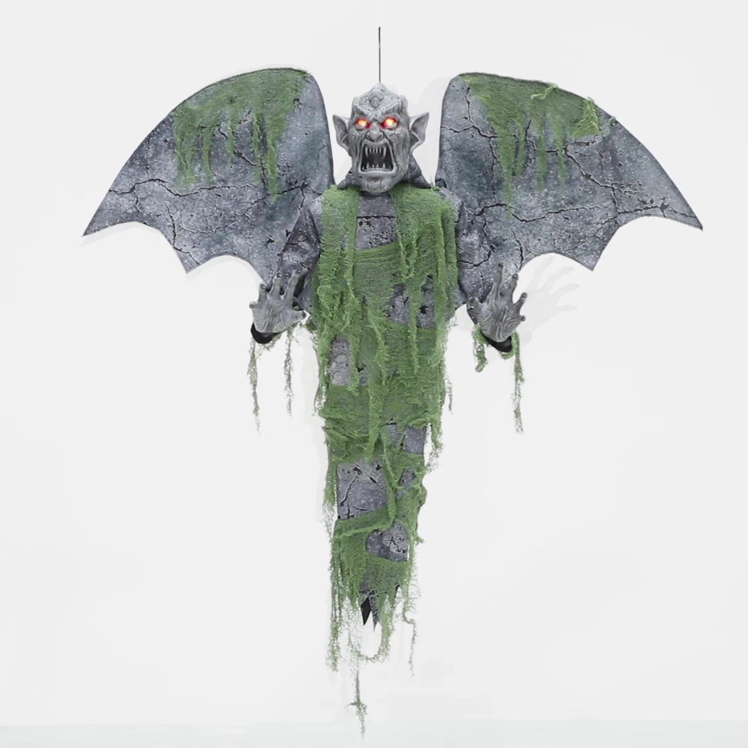 An ancient stone-looking Stone Gargoyle hangs and sways while his arms ending in long skeletal fingers move in and out, reaching to enfold you in his cold embrace! The grey granite appears to be covered in ragged greenish gauzy moss and is topped by a gruesome Gargoyle head displaying a sharp-toothed grimace. His LED eyes glow with an icy blue stare while an ominous bell tolls in the background. Requires 3 AA Batteries, not included. Hang in your next haunted scene for a truly scary setting!