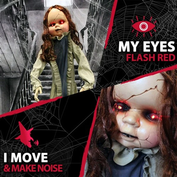 These blood-curdling creatures are sure to terrify any trick-or-treaters, co-workers, or customers. The animatronic Baby Betty is no ordinary infant. Every Halloween, she rises from the dead, searching for her mommy… and revenge. Her cracked face is a constant reminder of her tragic demise, and she is determined to find her killer. The full-sized baby eerily moves her small hands and arms while moaning. Her long red locks fall across her face as she twitches and swirls her body, her red eyes aglow. Baby Betty’s doll-like features are adorned with a worn burlap cloak that shields her as she hunts in the night. Her poseable arms bend into various positions to beckon unfortunate souls near and far. She may be a baby, but never underestimate Betty