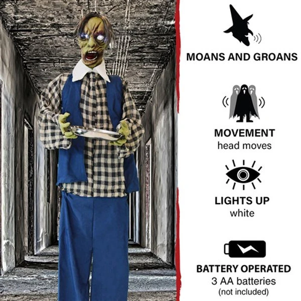 - 6.25-ft. standing animated zombie waiter for indoor and covered outdoor display
