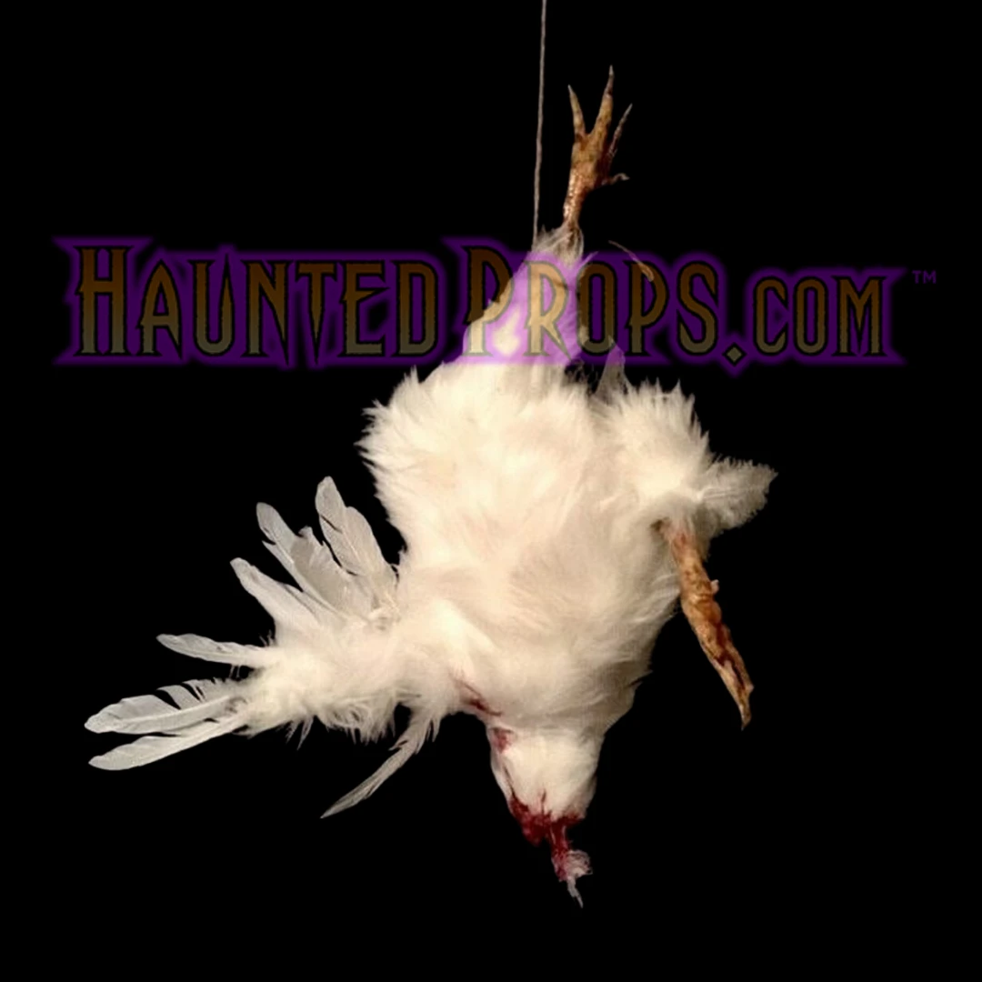 Headless hanging prop chicken is fabricated to last and give years of fright. Inner core is thick latex skinned poly foam filled.