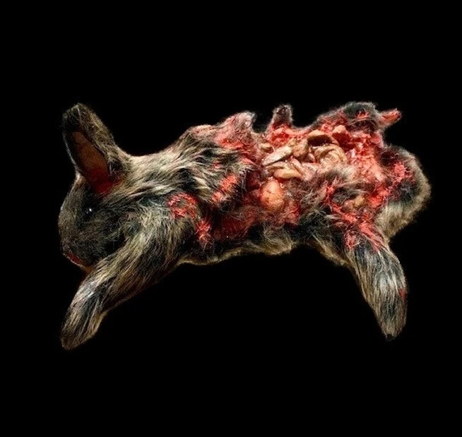 Large lifesized highly detailed dismembered rabbit. Thick latex skinned foam filled prop with faux fur.