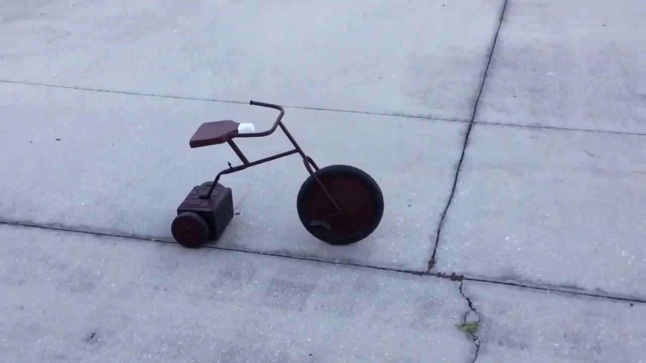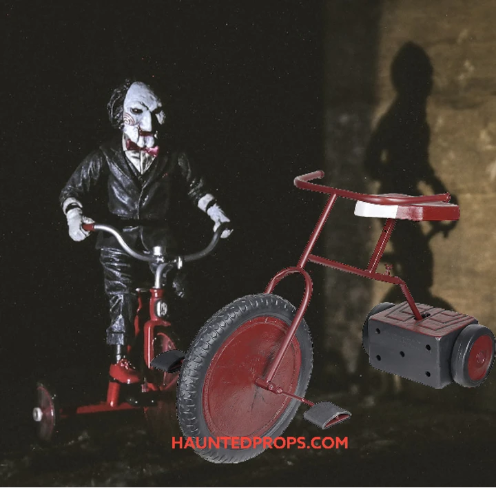 An old timeworn tricycle rolls back and forth all by itself! Sounds emanate from the prop like kids laughing on a playground wheels squeaking and wind blowing in the background. Creepy!