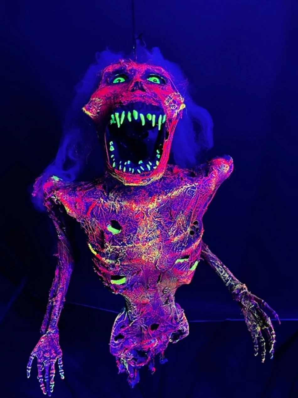Half body hanging ghost like creature in vivid UV responsive colors.