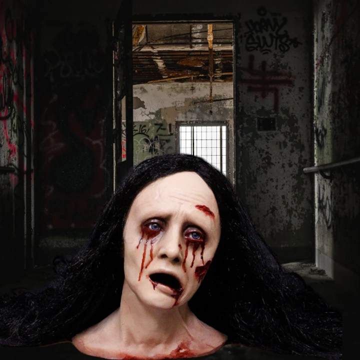 Bloody Mary head with eyes, wounds, and wig.