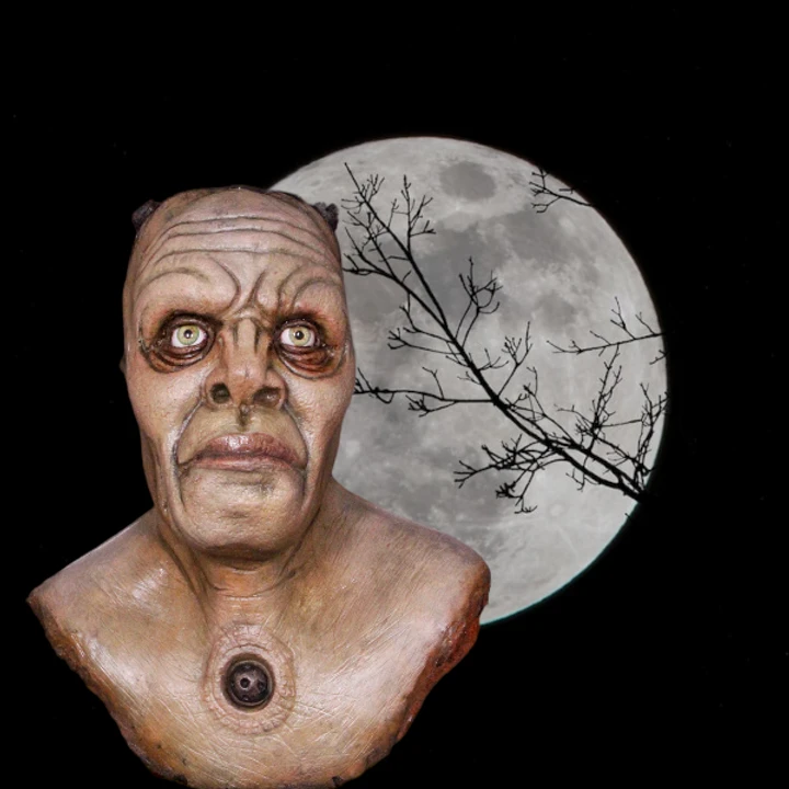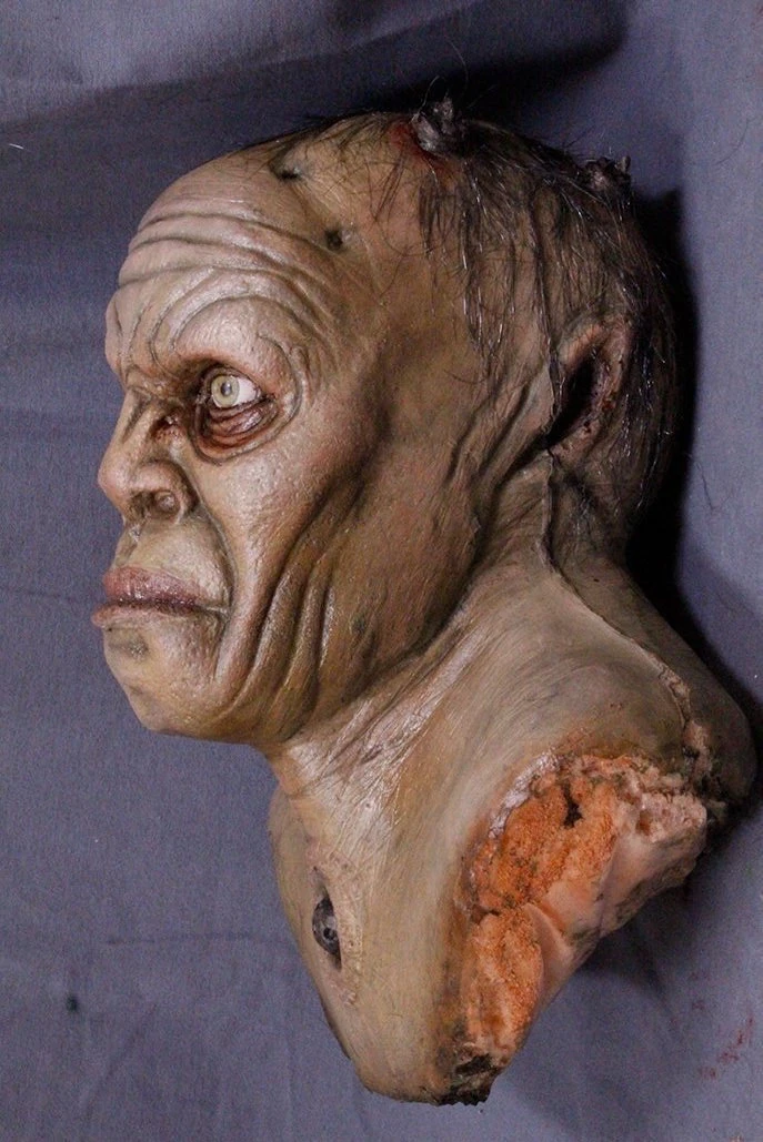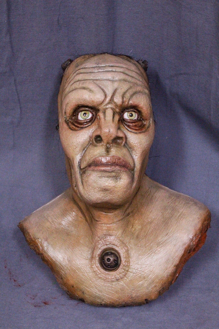 High detail, lifesize, urethane foam rubber sculpt of a Frankenstein-style monster, with electrodes in the scalp.