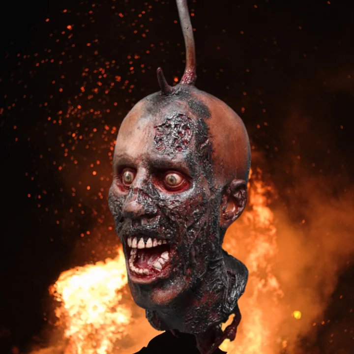 Burnt and gory zack head in polyfoam rubber with rubber hook embedded in his head for easy hanging. Lifesize.