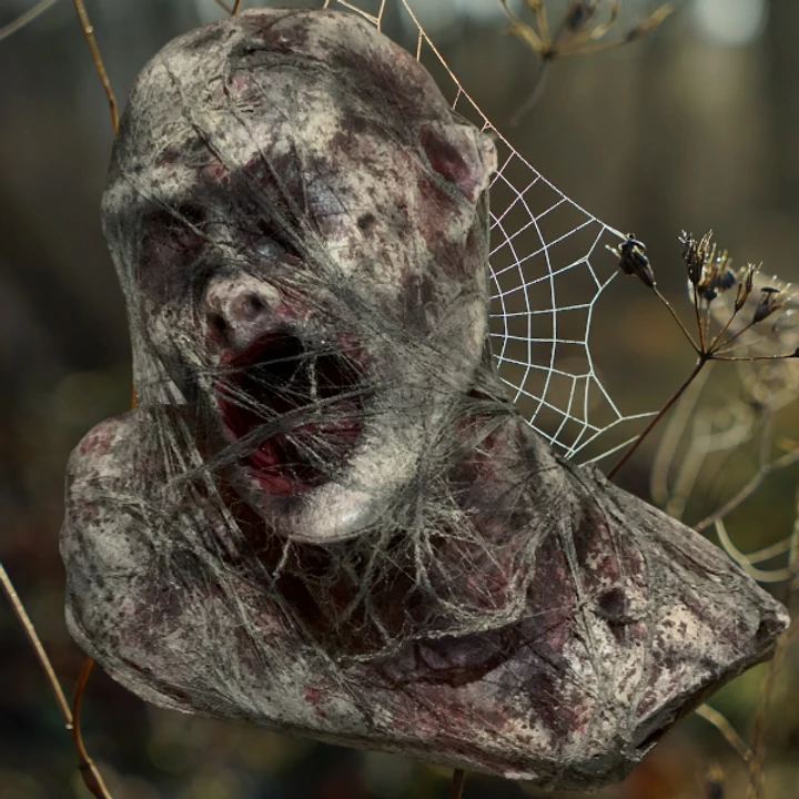 made of slip cast latex and poly foam , realistic stretch webbing dipped in latex , hand painted with rubberized arcylics