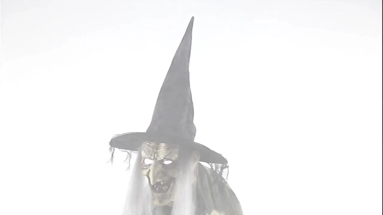 Don’t go walking into the woods alone or you may have a Cauldron CAT-tastrophe on your hands! This sinister sorceress stands before her bubbling black cauldron with flickering inchessmoldering coals inches while holding a ma the feet. The witch is dressed in a mottled-brown and black dress with rope belt a shredded-gauze shawl a creepy bone necklace and a matching pointed hat. This scary decoration is easy to assemble with quick-connect poles and includes volume control. With several spooky sayings one must be careful not to get in the way of this powerful witch! Animation: Eyes light up, Head and torso turn from side-to-side, Mouth moves, Cat hisses and flails over the green bubbling cauldron. Prop will say one of three sayings with each activation: inches(evil laughter) inches: inchesEh heh heh heh you will make a tasty meal – my favori the flesh from a black cat, but you will do nicely! Eh heheheheh! inches: inchesSee what happens when you cross my path? Let this be lesson to you – and a meal for me! Eh heheheh! inches). Activation options: Steady-on, Infra-red sensor (works up to 6.5′ feet away & works in all lighting conditions), Step-here pad (included). Power: UL power adapter that plugs into any standard outlet. Materials: Iron, PVC, polyester and cotton. Assembly required.