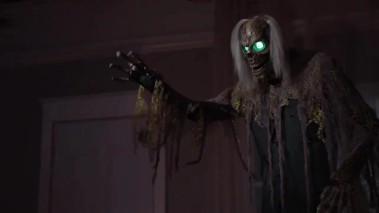 Lurking in the depths of your basement an undead terror awakens. The 7-foot Cellar Dweller Animated Prop covered in tattered rags has Glowing Green Eyes that pierce through the darkness, as his Head Turns and Mouth moves. His rough dry Voice speaks in a deathly tone as drips of water echo in the background. He speaks one of four scary phrases:
