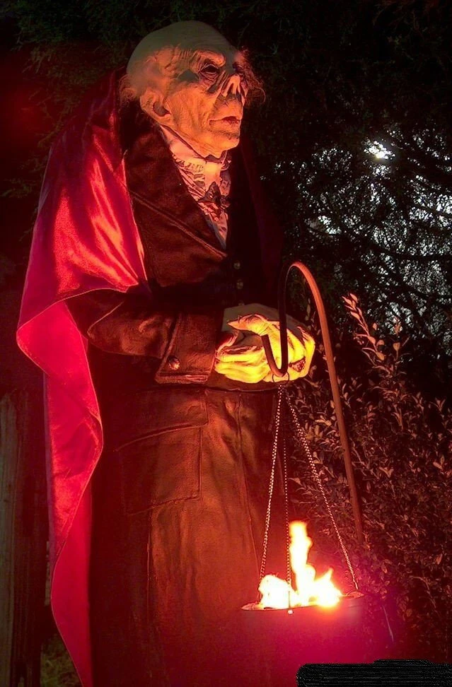 Stands 5′ 8″ tall! The creepiest full size prop to come out in years. Made of polyfoam, the count has light-up eyes that follow you as you walk past. Red satin cape conceals flat back so middle of room display is made possible. Easy construction two piece top and bottom allows for ups shipping. Stands on wooden base. Requires two d cell batteries, not included.
