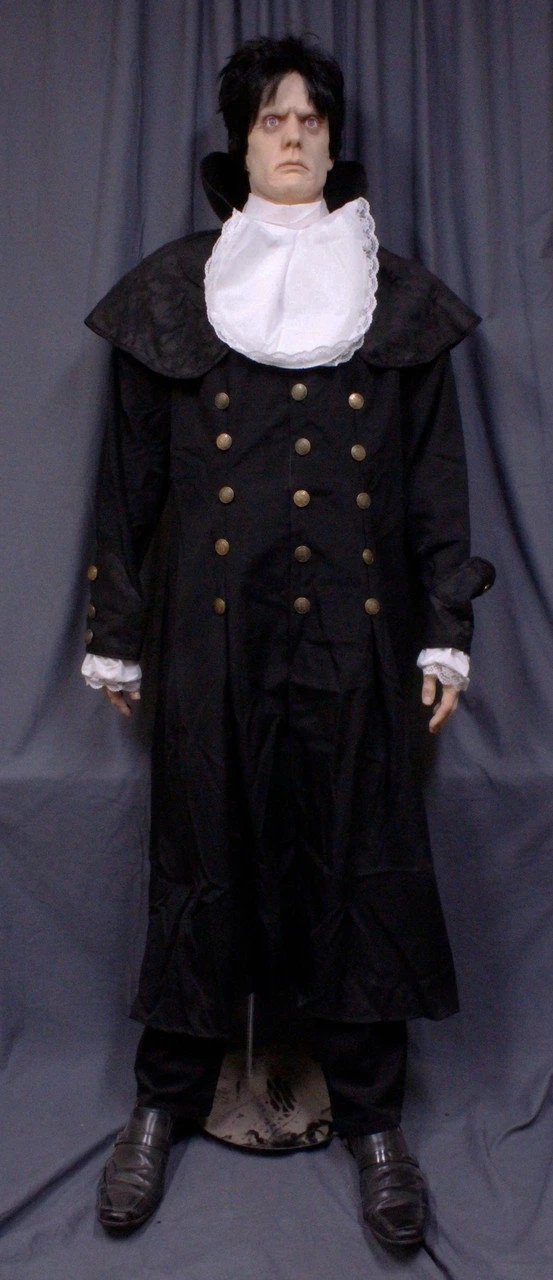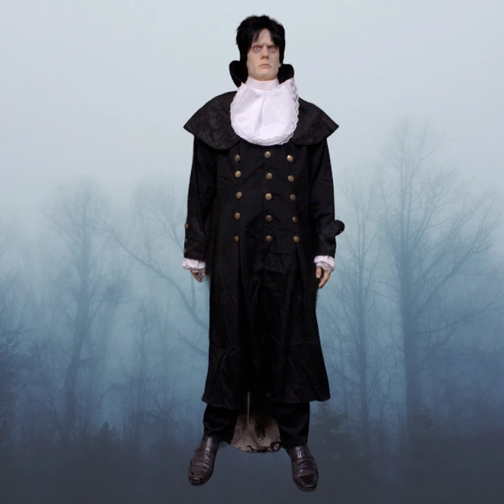 Count Franco is a 6ft standing vampire dressed in a victorian duster and cravat. Lifecast head and hands on a poseable mannequin figure.