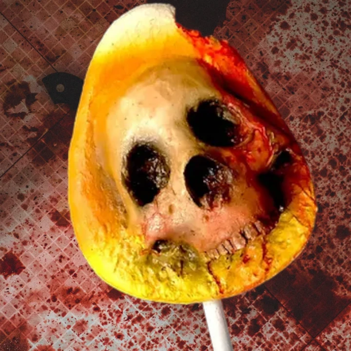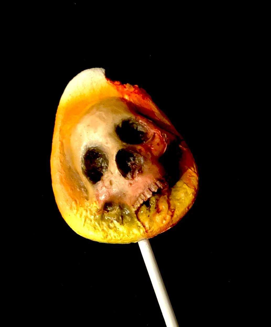 This huge candy corn has a life size skull on front and flat back on the other. Comes with wooden dowel for a easy to carry and twirl handle.