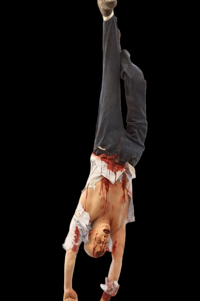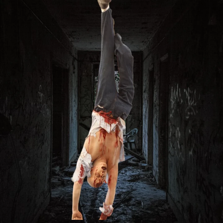Full size body with poseable dummy legs and full detailed gory torso. Ideal for hanging from his legs or reinforced wrists. Made of polyfoam rubber