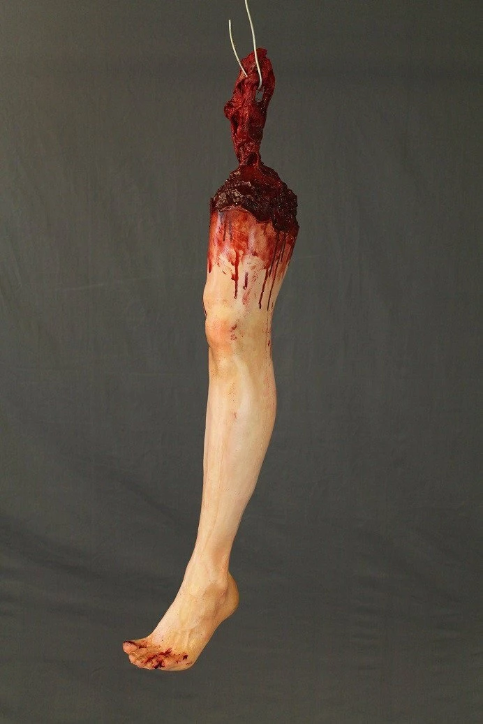 Full size lifecast male leg with gruesome gore dripping from the bloody stump. Gore has a reinforced loop for hanging.