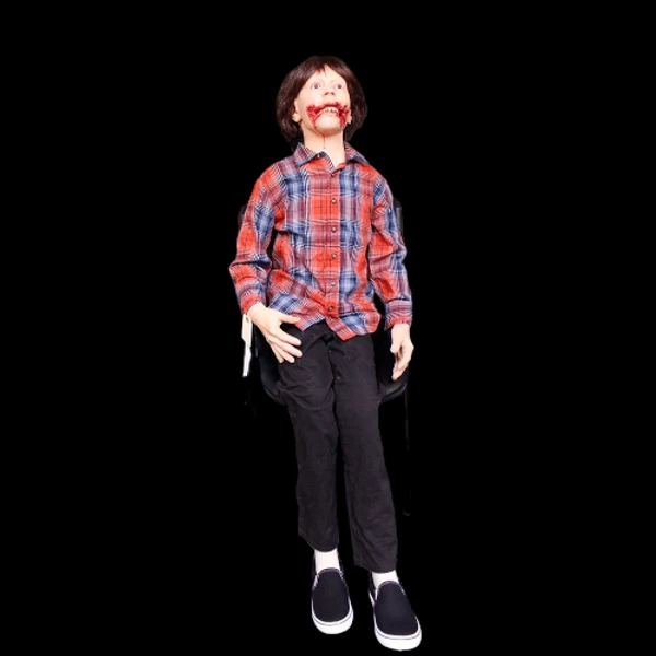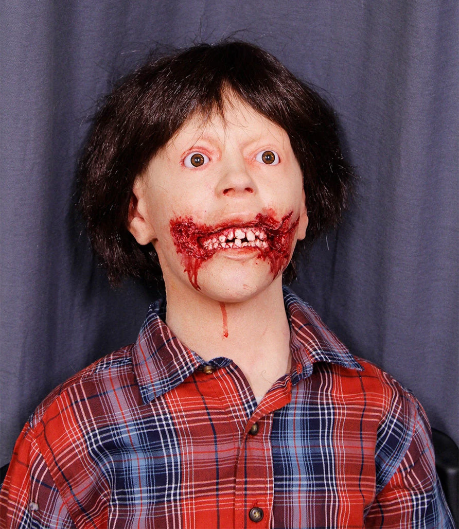 Ripped open mouth child figure for dental horror themes. 54″ tall child body with poseable arms and legs. Gender neutral face and body type to be styled as either a male or female child with wig and costume. Dummy body with lifecast head and hands. Pictured sitting. Also stands with removable stand.