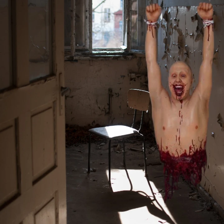 Lifesize, lifecast Olly torso with hacked up lips and exposed teeth meant to hang in scary dentists office, meat locker or other grisly location. Lots of blood and gore.