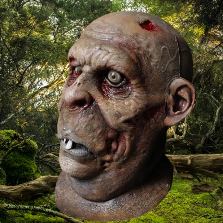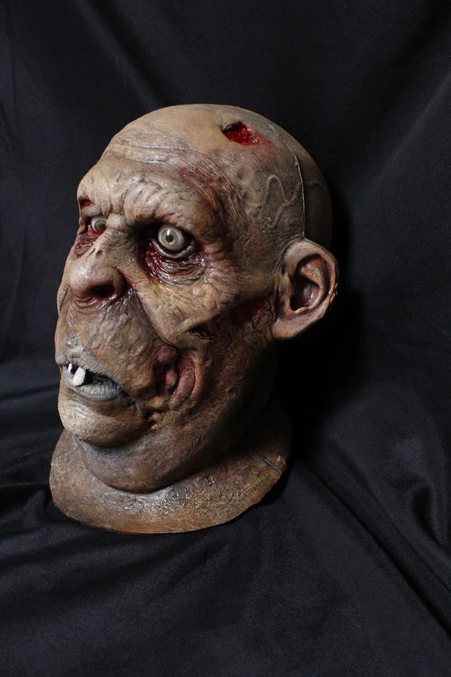 Our Dimwat Zombie Head features a glazed stare in one eye and the other a lazy eye, rotting skin, sagging jowls with two teeth poking out of his mouth and a indentaion on the top right side of his skull.