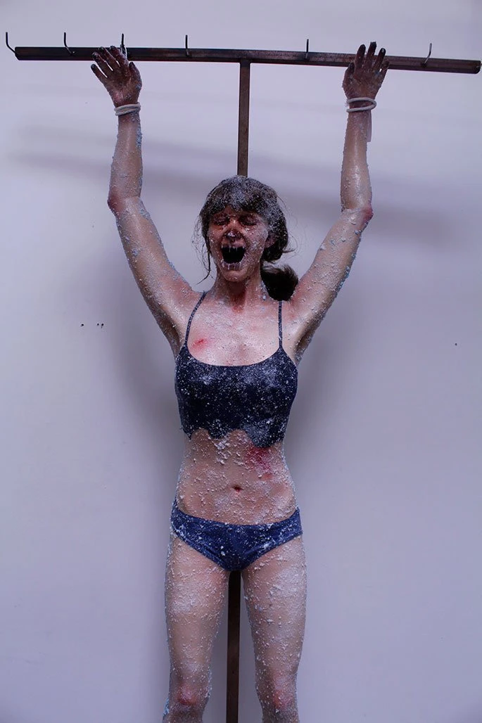 Lifesize female Agatha body with clothing, hair, and ice fx. Chains run through arms and chest for durable hanging.