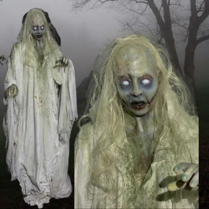 Our spooky beauty is ready for your attic, cemetery, or pretty much anywhere in your haunt! Standing life-size figure. Foam-filled latex upper torso with thick, quality latex head and hands. Lower body/leg area is made of metal pipes, covered by costume. Base is welded steel. Handmade and individually hand painted! Leg pipes come apart for shipping and easy storage!
