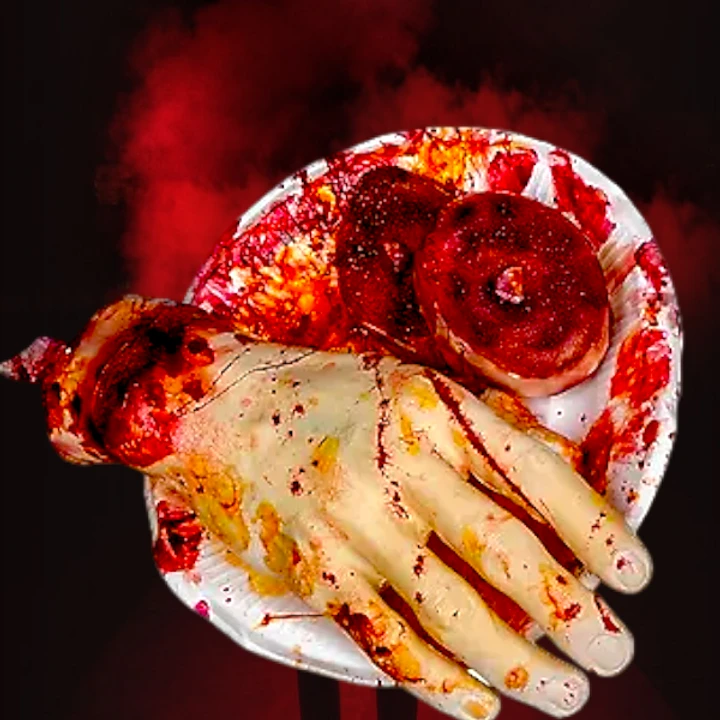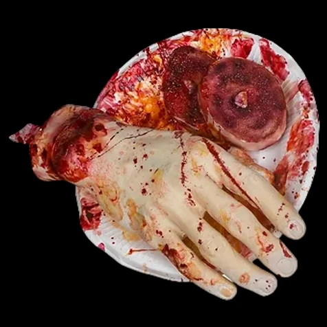 Gory Bloody Latex Hand in Bloody Paper Plate. 9 inches wide Comes with one cut up piece of bone. Looks delicious