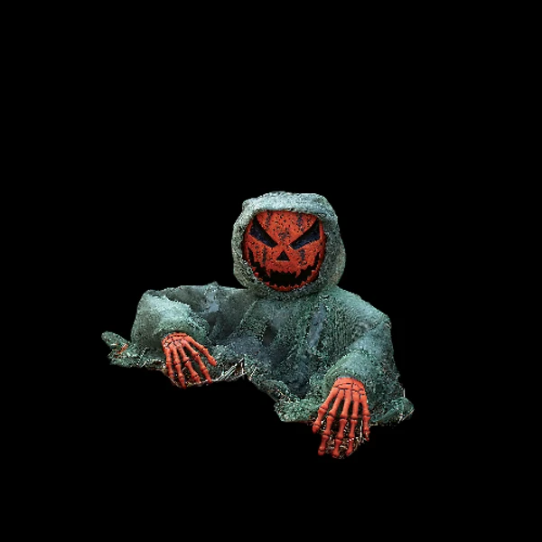 Menacing orange pumpkin face is covered with a spooky sickly green gauzy hood and shroud