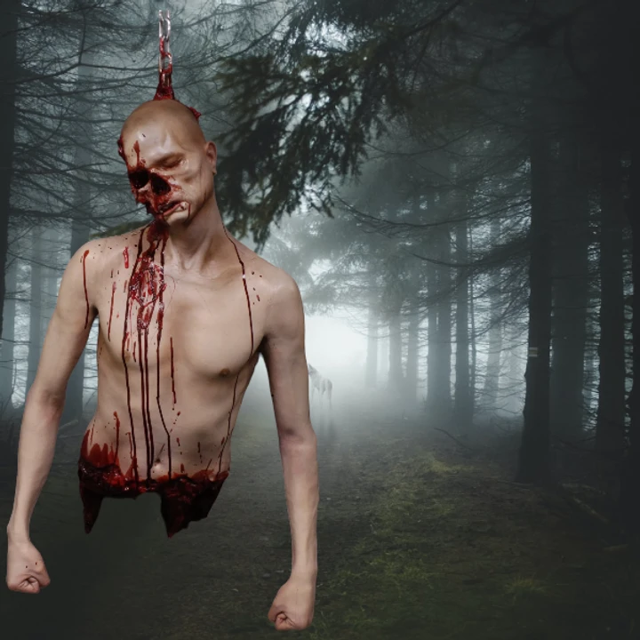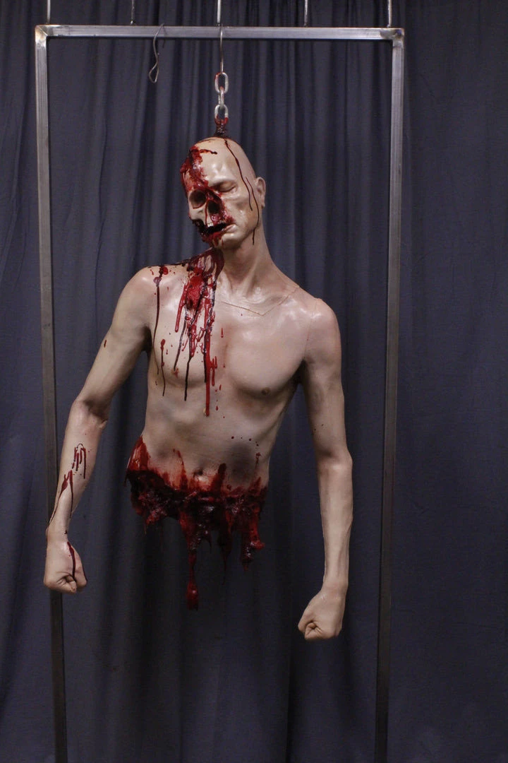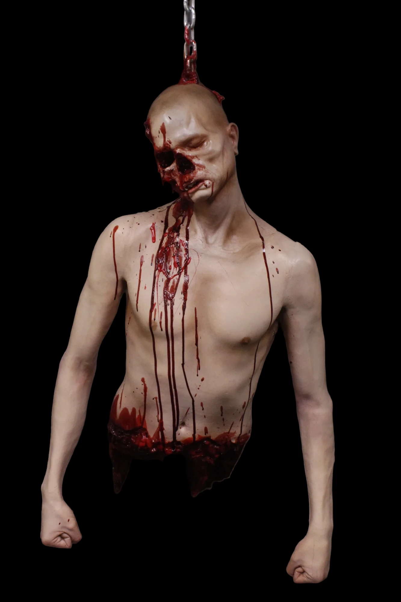 Lifesize male zombie or cadaver torso meat reinforced for hanging by embedded chain.