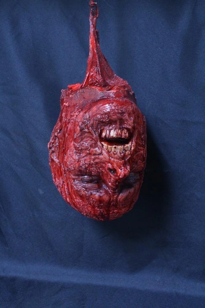 Kemmler skinned head in gory detail and meaty glory hanging upside down with chain attached to stump with gore surrounding chain. Product dimensions: 10″ x 8″ x 6″.
