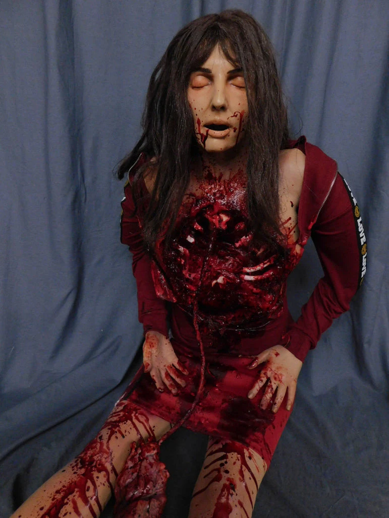 Gory female sitting cadaver body with ribs cut open and vinyl heart hanging by a vein. Top and bottom half come apart for easy shipping and storage.