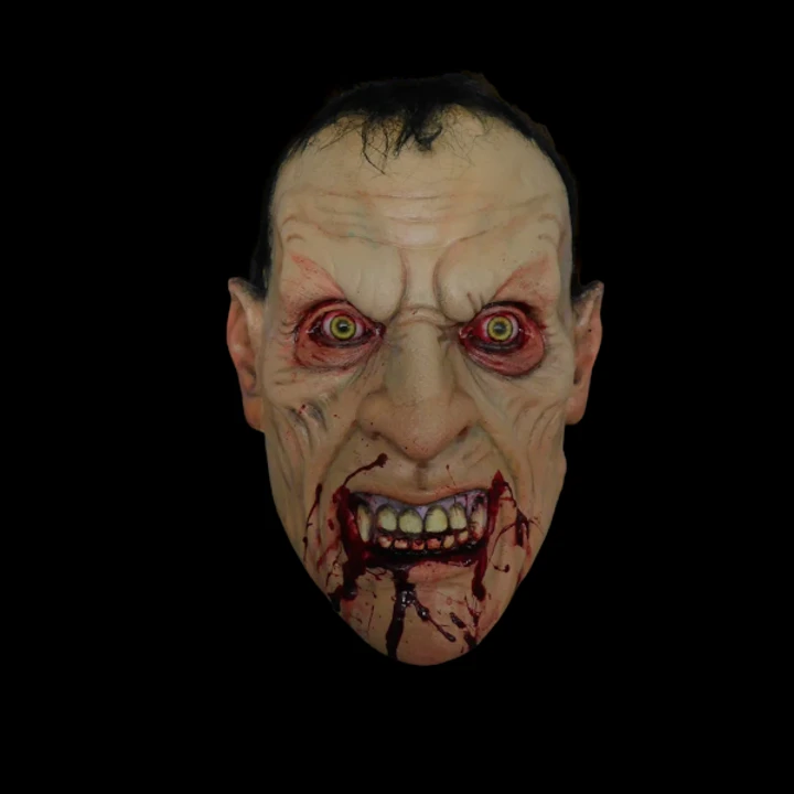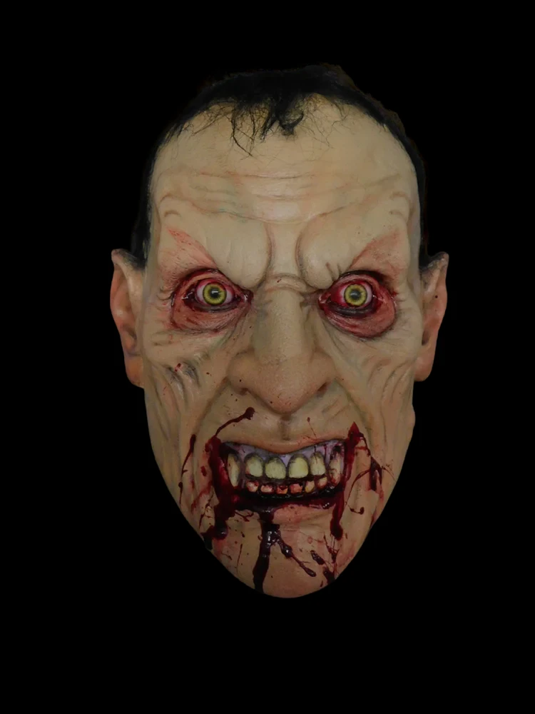 Our Malice Vampire Head features yellow eyes, pointed ears, sunken cheeks, a snarling fanged mouth and a textured cranium. Evil looking vampire head.