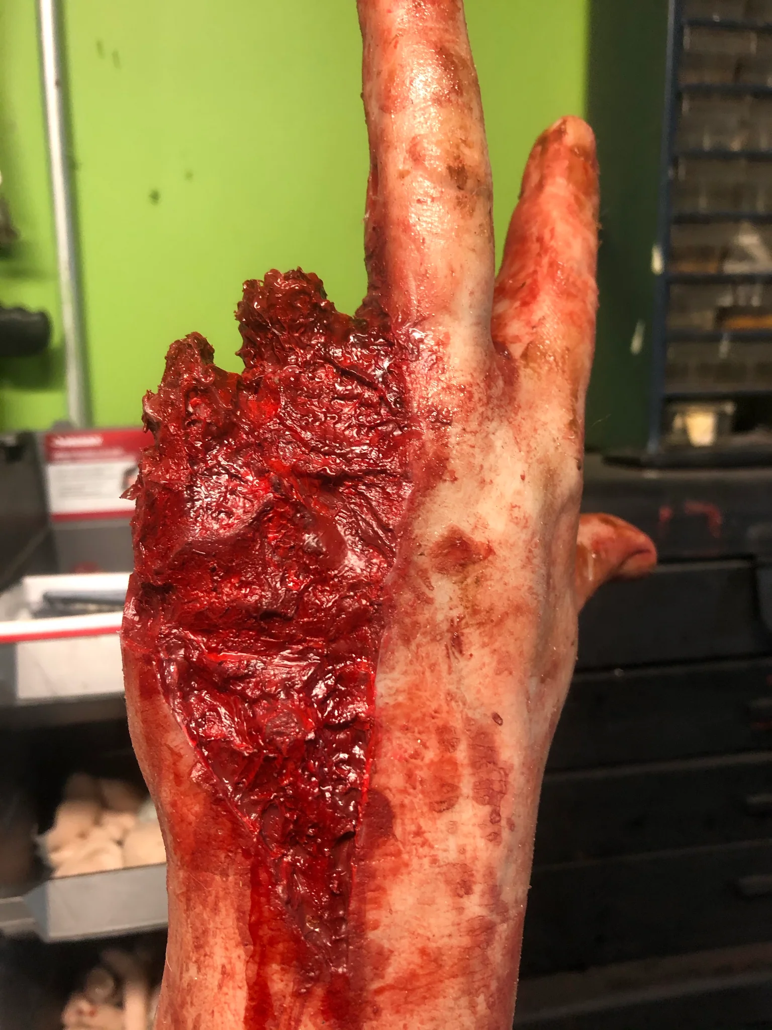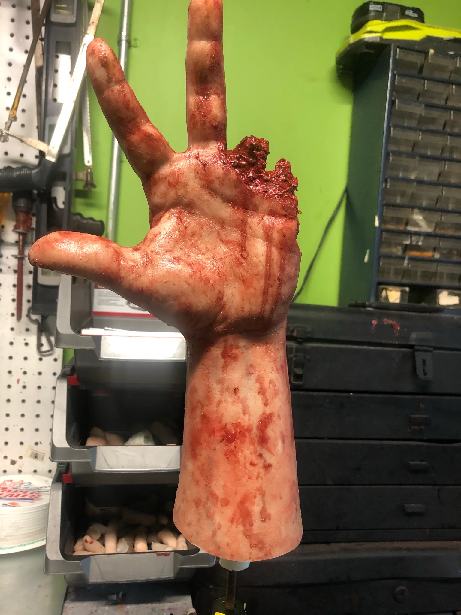 This hand is based off the gunshot wound Michael Myers got during the H40 movie. This arm is 90% solid silicone and is highly detailed pvc piping for mounting optional at no extra cost. These are made to order so each one is unique but similar.Â