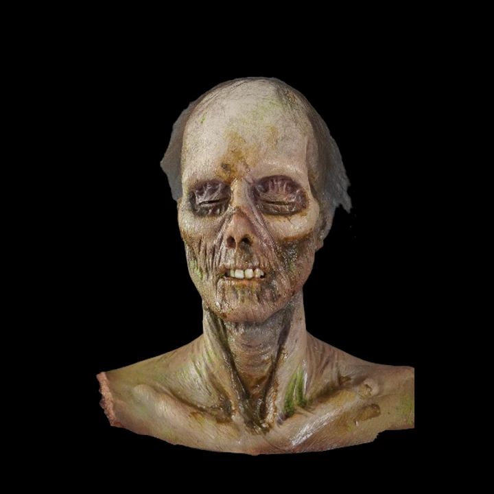 Beautifully detailed lifesize female dessicated corpse head with teeth. Cast in polyfoam rubber.