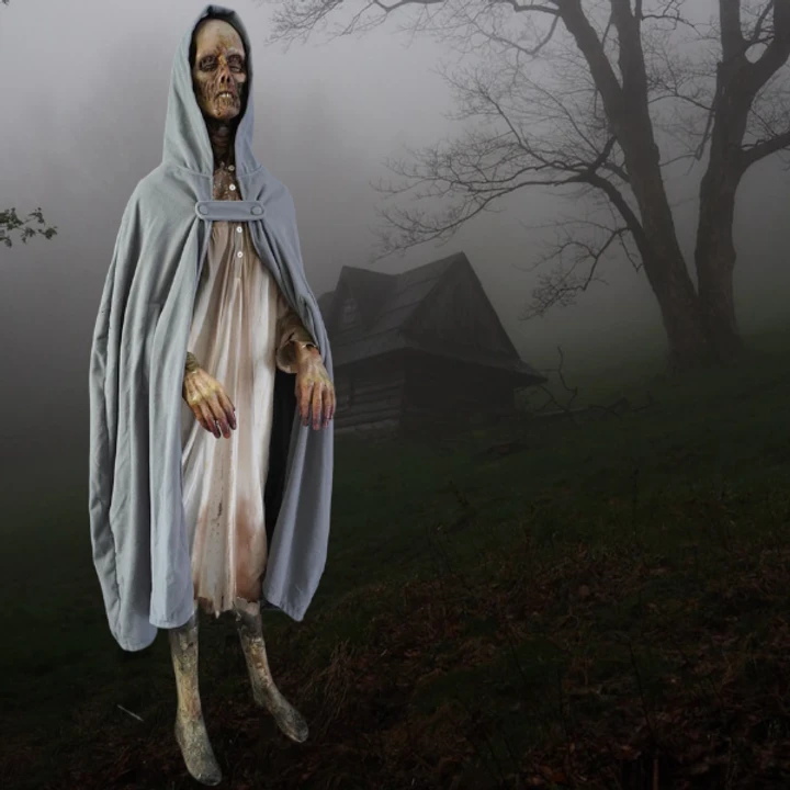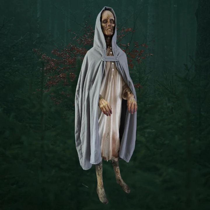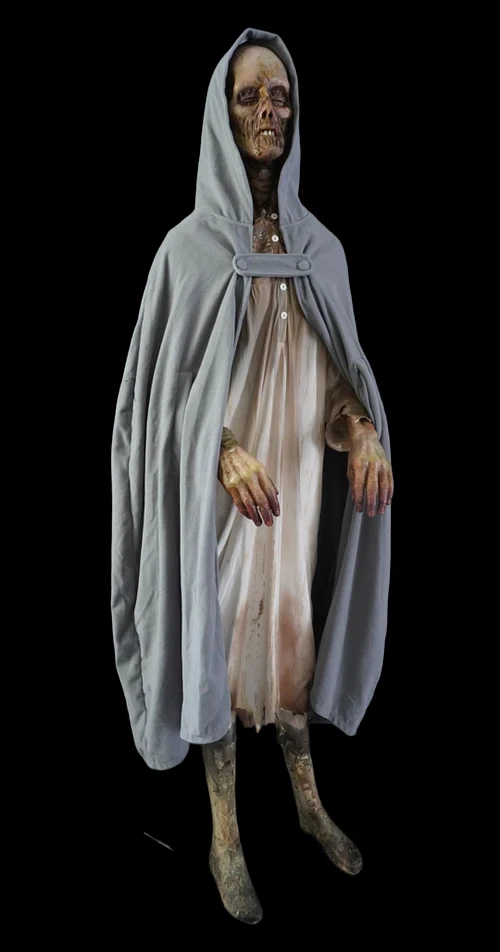 Lifesize standing decayed witch figure. Features a rotted face and nose, sunken eyes, and a slightly open mouth. Head on a poseable mannequin body.