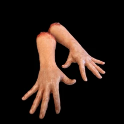 This pair of silicone arms is highly detailed and film ready. The perfect addition to your haunt or next film project. The hands and fingers are solid silicone and the forearm is silicone skinned with a foam core. Blood splatter and scaring can be customized to your liking