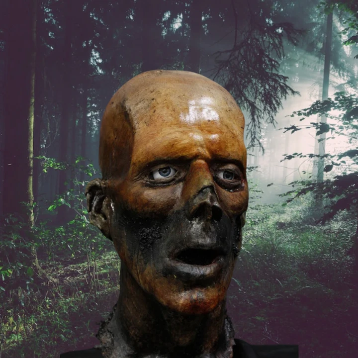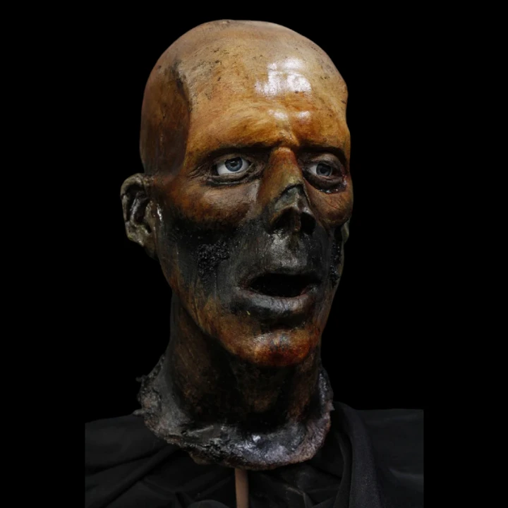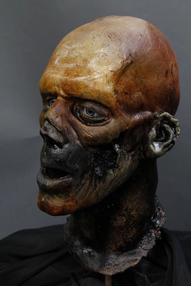 Sallow Head is in a state of desiccation where the soft tissue is melting off the face while the top half of the skin stays dry and leathery. Mouth open slightly and eyes sunken.