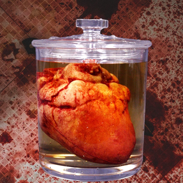 Small lifelike heart in cast in hollow urethane rubber in a shatterproof acrylic apothecary jar.