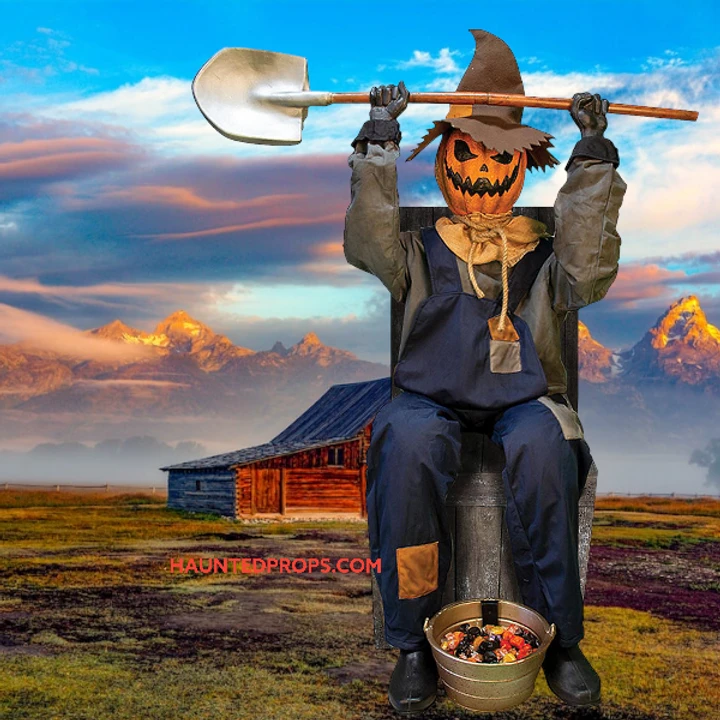 Your guests will be in for a haunting surprise when they are greeted by this scary Animated Smiling Jack Greeter prop. This pumpkin man prop is the perfect addition to your haunted Halloween display. The Smiling Jack Greeter with Chair features a pumpkin face figure with overalls, scarecrow hat and holding a shovel. The Smiling Jack Greeter also comes with a brown chair. Requires 4 AA batteries (not included).