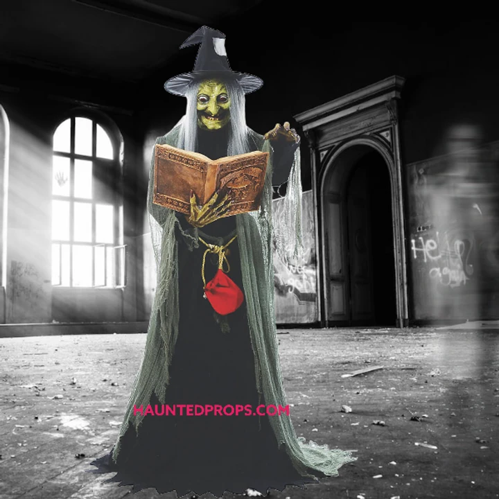 The Spell Speaking Witch stands approximately 5’8 inches tal the top of her witch hat and features a latex head with light up eyes & moving mouth an easy-to-assemble metal frame slush-PVC hands & book with green LED lights that illuminate her face as she casts her wicked spells upon you. This wicked wiccan is dressed in a black fabric costume with shredded-gauze details and a matching black witch hat with attached grey stringy hair. This witch also has a sack for her potions that hang off of the rope belt tied around her waist. Plug in the UL power adapter into any standard outlet & choose from Steady-On Infrared Sensor or Step-Here Pad (included) activation options to operate. Once activated the Spell Speaking Witch’s eyes will light up with an other-worldly glow as she turns from side-to-side at the waist, the green light from her book illuminating her moving mouth & will say one of three spell casting sayings. The infrared sensor works up to 6.5′ feet away & works in all lighting conditions. Item includes volume control. Easy-to-assemble quick-connect poles. Assembly required.