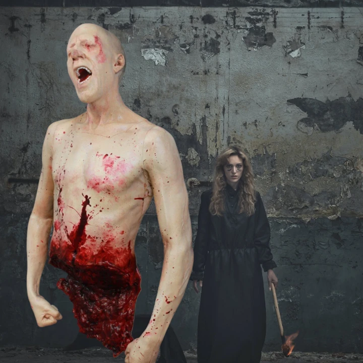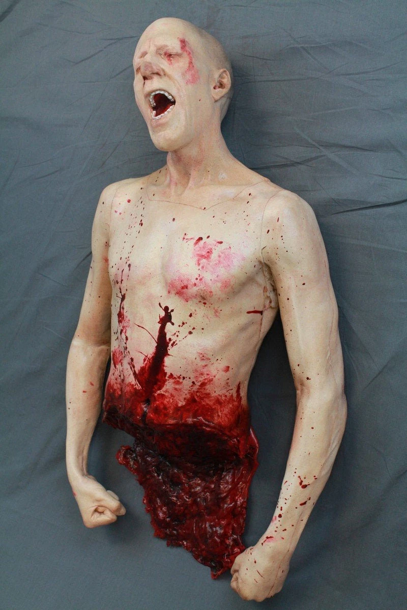 Gory half Martin with a painful scream face and bloody guts spilling from inside.