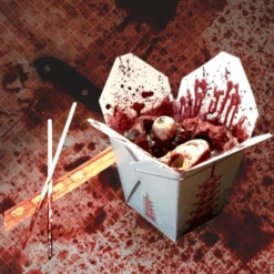hey what’s for dinner? Sum yung gai! complete with bloody chopsticks, this prop is sure to turn heads as you pick at your take out dinner from that sketchy chinese food place around the block. makes a great practical joke item! Just slip into the bag of take out and it will blend in until some hungry unexpecting victim opens it up to see their food staring right back at them!