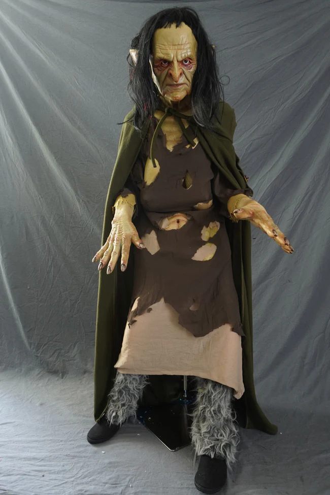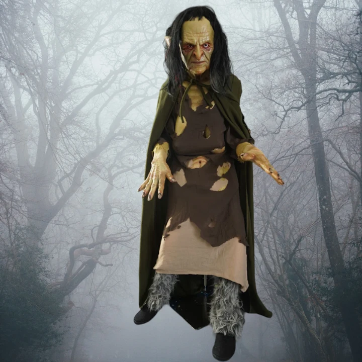 Lifesize forest witch figure. Features a sculpted head, torso and hands on a poseable mannequin body with a removable lightweight stand.