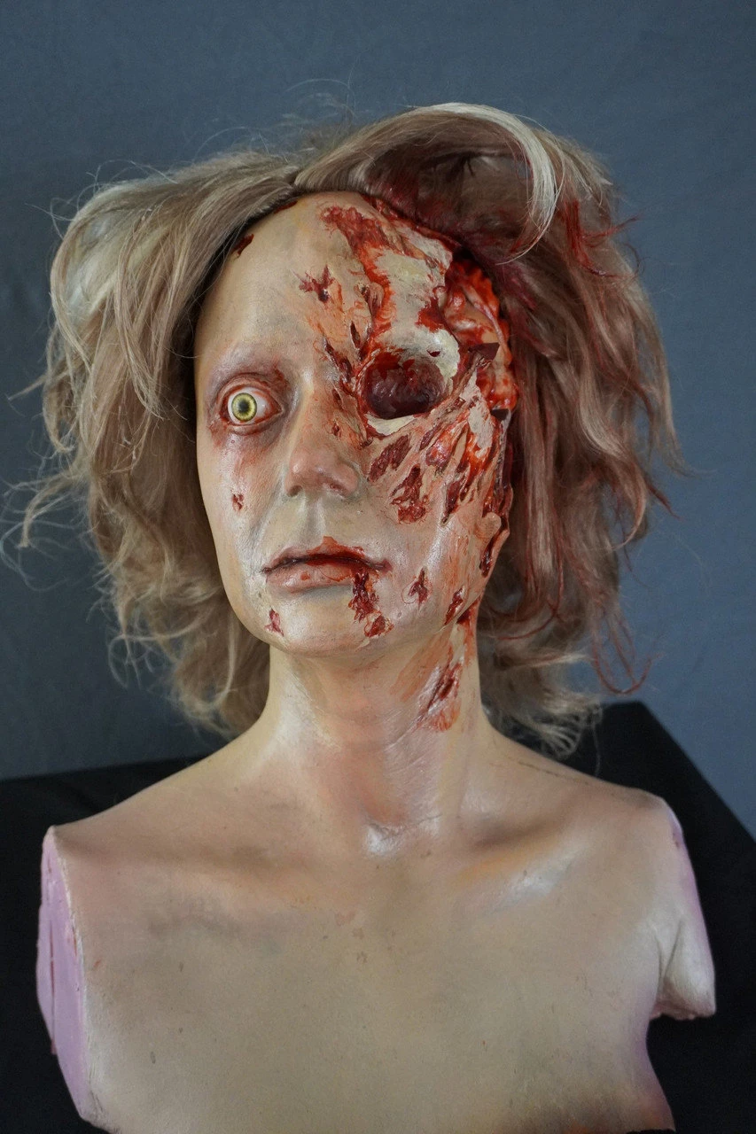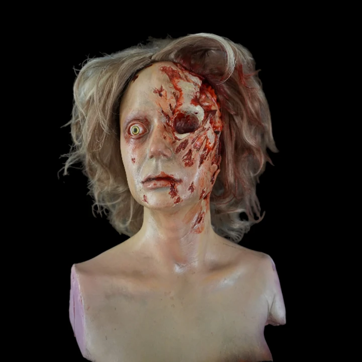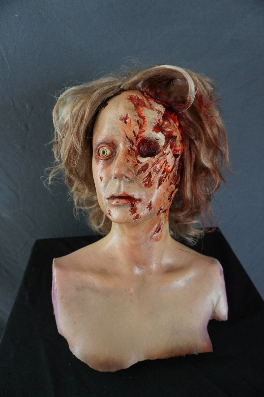 Beautifully detailed lifesize female zombie head. Cast in polyfoam rubber.