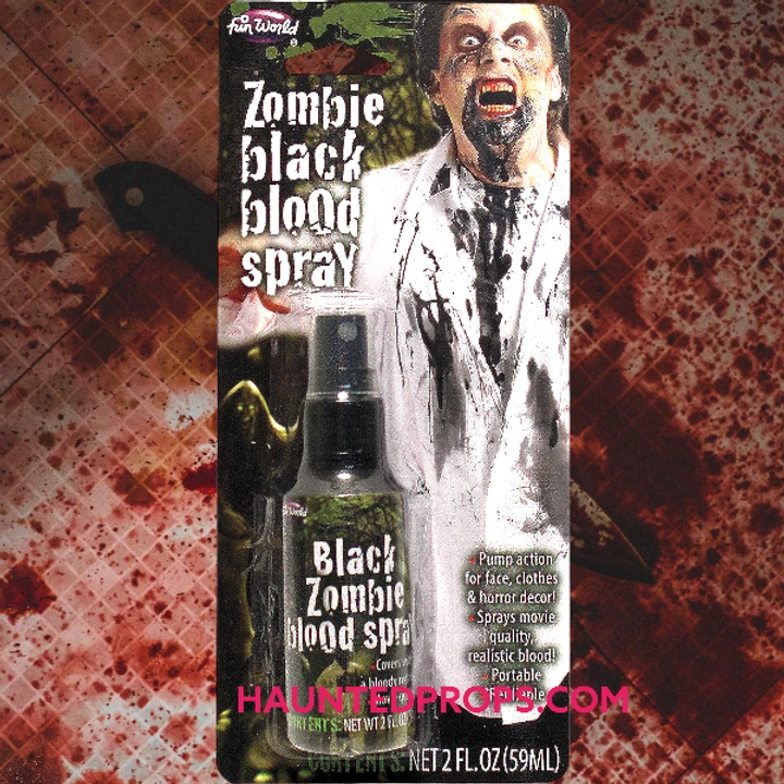 Zombie Blood SprayUse to give your bloody makeup the perfect final touch, or on your clothes or a hundred different ways!Include: 2 oz. bottle zombie spray black blood.