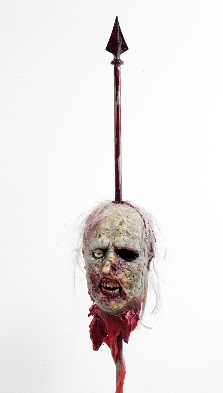 5 ft tall standing steel spike impaled with a classic zombie head. Spike is rubber tipped.